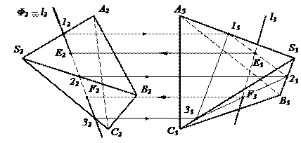 На рис. 46 приведен пример построения на комплексном чертеже точек пересечения E и F прямой l с треугольной пирамидой SABC.