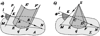 2) строим прямые пересечения EE, EE' и SE, SF вспомогательных плоскостей Φ и Φ* с конической и цилиндрической поверхностями, для чего предварительно находим прямые MN, которые являются результатом пересечения посредников Φ и Φ* с плоскостями оснований Λ и Σ заданных поверхностей. Точки E и F получаем в пересечении прямых MN с линиями оснований q;
