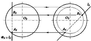 1) вспомогательные плоскости Φ (p ∩ l) и Φ* (SK ∩ l) проводим через заданную прямую l соответственно параллельно образующим цилиндрической поверхности и вершину S конической поверхности;