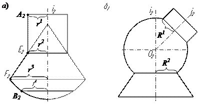 В примерах приведенных на рис. 54, а и б даны лишь фронтальные проекции. Причем оси поверхностей вращения i и j расположены параллельно плоскости проекций П2, вследствие чего окружности, получаемые при пересечении заданных поверхностей, изображаются на эту плоскость проекций в виде прямых.