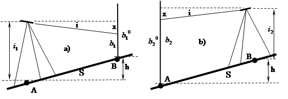 Во-вторых, величина угла i, то есть проекция на отвесную плоскость угла между осью уровня и визирной осью трубы, должна быть меньше 10”. Эту поверку разрешается выполнять тремя способами [5]; мы изложим первый способ - двойное нивелированием вперед. На местности забивают два колышка А и В на расстоянии около 50 м один от другого. Нивелир устанавливают над точкой А так, чтобы окуляр трубы находился на одной вертикальной линии с точкой (рис.3.2-a). От колышка до центра окуляра измеряют высоту прибора