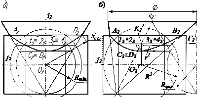 На рис. 55, а показана на комплексном чертеже фронтальная проекция пересекающихся цилиндрической и конической поверхностей вращения, общая плоскость (i ∩ j) симметрии которых параллельна плоскости Π2. Следовательно, фронтальные очерки заданных поверхностей, расположенных в этой плоскости, пересекутся. Точки их пересечения, проекции которых обозначены на чертеже буквами А2 и В2,являются наиболее удаленными относительно горизонтальной плоскости проекций. Расстояние от точки (О) пересечения осей до точки А (или В) в данной задаче определяет радиус максимальной сферы Rmax, необходимой для решения задачи.