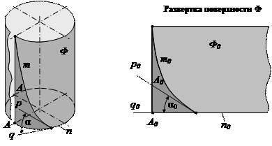 3. Угол α между касательными р и q к кривым m и n поверхности Ф соответствует равный ему угол α0 на развертке Ф0 .