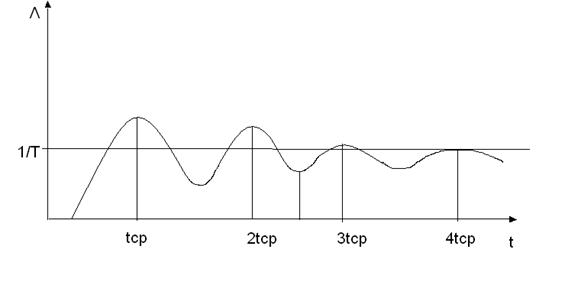 параметр потока отказов Λ(t) восстанавливаемой системы возрастает, затем начинаются колебания, затухающие на уровне