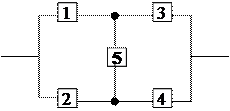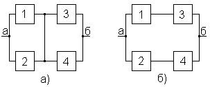 В этой схеме элемент 5 выделяется как особый с двумя возможными состояниями: 1 – наличие цепи между точками «а» и «б»; 2 – отсутствие цепи между точками «а» и «б». Поэтому можно перейти от мостиковой схемы к двум структурным схемам, соответствующим состояниям «1» и «2»: