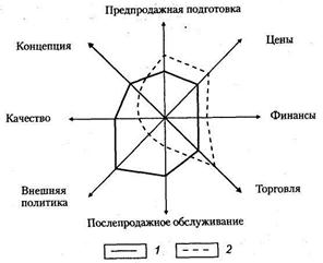 На рис. сопоставлены многоугольники конкурентоспособности двух фирм по восьми критериям. Соответственно на каждой из восьми осей с использованием определенного масштаба измерения отмечаются точки, соответствующие значениям критериев. Линия, проходящая через них, образует многоугольник. На рис. показано, как отличается по отдельным критериям продукция фирмы А и Б.