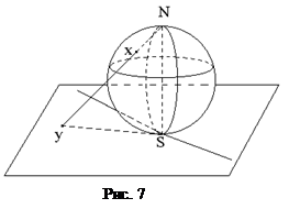 5) «Стереографическая проекция». Рассмотрим отображение f: A ®ℝ2, где АÍℝ3 – сфера без северного полюса N, ℝ2 – плоскость, параллельная экватору и касающаяся сферы в точке S. Каждой точке х сферы (за исключением N) функция f ставит в соответствие точку плоскости у, в которой луч N x пересекает плоскость. См. рис.7. Тогда: