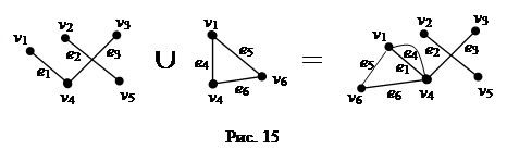 1) Объединение двух графов G =(V, E) и G ¢=(V ¢, E ¢) есть граф S =(V ∪ V ¢, E ∪ E ¢).