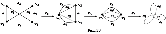9) Стягивание ребра – ребро удаляется, а его концевые вершины отождествляются. На рисунке 23 последовательно стягиваются ребра е 1, е 3, е 2.