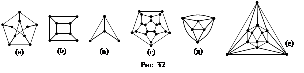 Например, цикл является 2-валентным графом. На рисунке 32 (а) изображен 3-валентный граф Петерсона, графы Платоновых тел: (б)–куба, (в)‑тетраэдра, (г)–додекаэдра, (д)–4-валентный граф октаэдра и (е)–5-валентный граф икосаэдра.