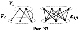 Граф G= (V, E) называется двудольным, если множество его вершин V можно разбить на два непересекающихся подмножества V 1 и V 2, что каждое ребро графа имеет одну концевую вершину в V 1, а вторую в V 2. См. рис.33 слева. При этом не обязательно, чтобы каждая пара вершин из V 1 и V 2 была соединена ребром. Если же это так, то граф называется полным двудольным графом и обозначается обычно Km,n, где m и n – число вершин в V 1 и V 2 соответственно. См. рис.33 справа.