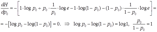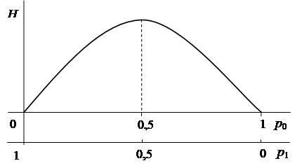 При граничных значениях p 1 = 0 (p 0 = 1 – 0 = 1) и p 1 = 1 (p 0 = 1 – 1 = 0) в соответствии со свойствами частной энтропии энтропия источника равна нулю. Так как эта величина положительна, то при промежуточных значениях вероятностей p 0, p 1 оно будет иметь экстремум. Среднее значение энтропии на сигнал здесь