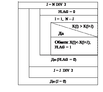 Сортировка заканчивается просмотром с J=1. В методе Шелла первоначально J устанавливается равным INT(N/2), а затем сокращается вдвое.