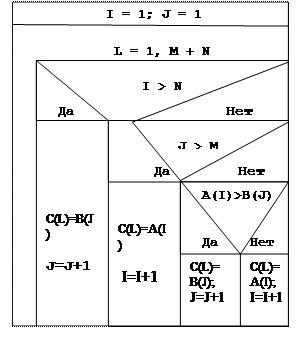 C(N+M) двух упорядоченных массивов A(N) и B(M) имеет вид.