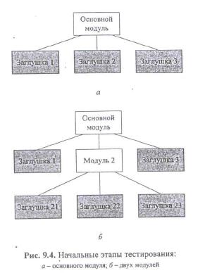 В этом случае автономно тестируется только основной модуль. При его тестировании все вызываемые им модули заменяют модулями, которые в той или иной степени имитируют поведение вызываемых модулей (рис. 9.4). Такие модули принято называть «заглушками». В отличие от тестирующих программ заглушки очень просты, например, они могут просто фиксировать, что им передано управление. Часто заглушки просто возвращают какие-либо фиксированные данные.