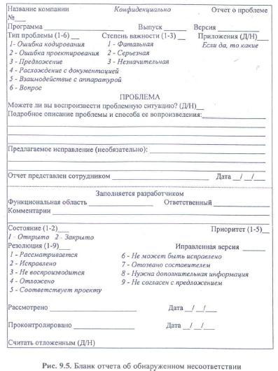 Каждое отклонение от спецификации обязательно документируют, заполняя специальный протокол (рис. 9.5). Наиболее интересными полями протокола являются тип проблемы и ее описание.