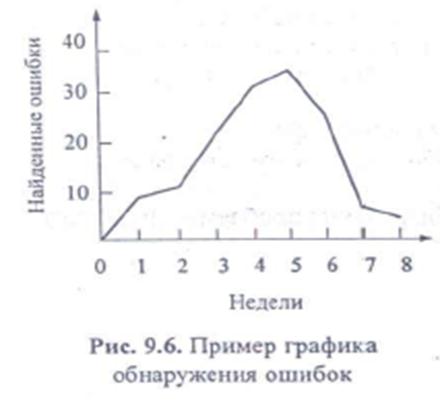 • основанные на исследовании результатов тестирования - строят график зависимости количества обнаруженных ошибок от времени тестирования, если он напоминает график, представленный на рис. 9.6, то тестирование можно завершать.