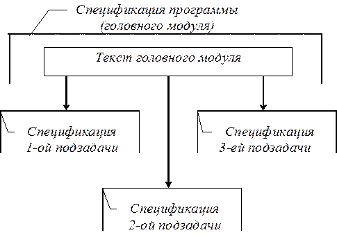 Как уже отмечалось выше, в качестве модульной структуры программы принято использовать древовидную структуру, включая деревья со сросшимися ветвями. В узлах такого дерева размещаются программные модули, а направленные дуги (стрелки) показывают статическую подчиненность модулей, т.е. каждая дуга показывает, что в тексте модуля, из которого она исходит, имеется ссылка на модуль, в который она входит. Другими словами, каждый модуль может обращаться к подчиненным ему модулям, т.е. выражается через эти модули. При этом модульная структура программы, в конечном счете, должна включать и совокупность спецификаций модулей, образующих эту программу. Спецификация программного модуля содержит