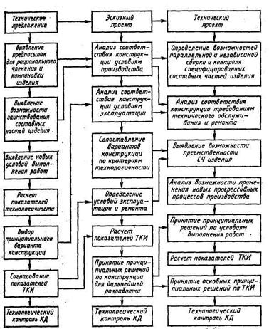 Система обеспечения ТКИ должна предусматривать возможность принятия решений как по конструкции изделия, так и по условиям его производства, эксплуатации и ремонта уже на ранних стадиях проектирования. Конструктор не может перейти от одного этапа конструирования к другому, не обеспечив требований ТКИ. Однако обеспечение конструктивной и технологической преемственности облегчает задачу создания конструкции, так как упорядочивает состав этапов и сокращает сроки подготовки производства.