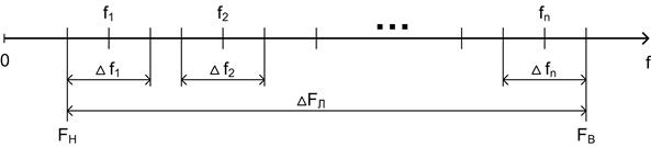 При частотном разделении (FDMA - Frequency Division Multiple Access) для различных каналов отводятся непересекающиеся участки полос частот Δf1, Δf2, …, Δfn в полосе пропускания линии связи (см. рис.3.5.2).