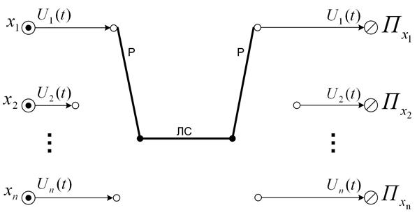 по линии связи к соответствующим приемникам Пх1 ÷ Пхn; ЛС – линия связи; Р - распределитель