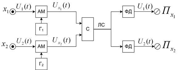 Сигналы датчиков X1 и Х2 модулируют амплитуду синусоидальных носителей, различающихся по фазе на 90°. После модуляторов сигналы Ux1(t) и Ux2(t) имеют амплитуды, определяемые модулирующими сигналами с датчиков, а фазы соответственно φ1 и φ2 =φ1 +