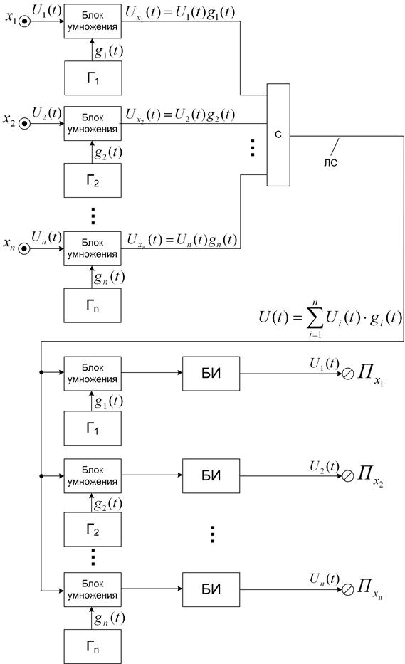 X1 ÷ Xn – источники сигналов; Г1 ÷Гn – генераторы сигналов ортонормированный системы сигналов g1 ÷ gn; С – сумматор; БИ – блоки интегрирования; Пх1 ÷ Пхn – приемники сигналов