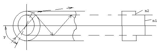 Материал внутренней жилы имеет показатель преломления n1, а материал внешнего слоя n2, при этом n1>n2, т.е. материал внутренней жилы оптически более плотный, чем материал оболочки. Для излучения, входящего в цилиндр под малыми углами по отношению к оси цилиндра, выполняется условие полного внутреннего отражения: при падении излучения на границу с оболочкой вся энергия излучения отражается внутрь жилы световода. То же самое происходит и при всех последующих отражениях; в результате излучение распространяется вдоль оси световода, не выходя через оболочку. Максимальный угол отклонения от оси, при котором еще имеется полное внутреннее отражение, определяется выражением A0=sin y0=