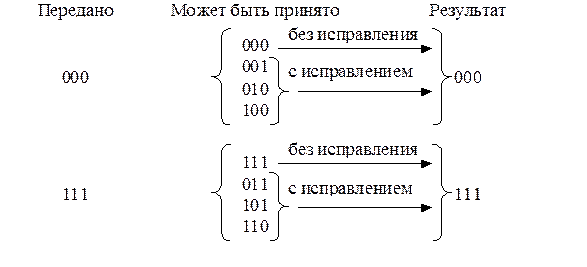 В трехразрядном коде под информационный символ отведем один разряд, а два других отведем под избыточные контрольные символы (алгоритм формирования контрольных символов пока не важен). Из всех трехразрядных кодовых комбинаций выберем разрешенными 000 и 111. Тогда при передаче и приеме информации могут возникать следующие ситуации (при возможности возникновения только одной ошибки):
