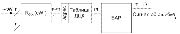 2. вычисляется вес остатка. Если вес остатка w ≤ s, то принятая комбинация складывается по модулю два с остатком. Сумма даст исправленную комбинацию. Если w > s, то