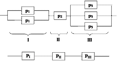 Р = PI· PII· PIII = [1 – (1 – р1)2] р2 [1 – (1 – р3)3]