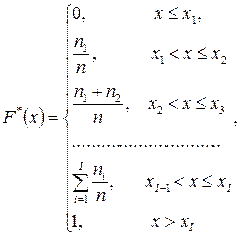 Статистическая функция распределения любой случайной величины – прерывной или непрерывной – представляет собой прерывноую ступенчатую функцию, скачки которой соответствуют наблюденным значениям случайной величины и по величине равны частотам этих значений. При увеличении числа опытов n, согласно теореме Бернулли, при любомх частота события Х<х приближается (сходится по вероятности) к вероятности этого события. Следовательно, при увеличении n статистическая функция распределения F*(x) прближается (сходится по вероятности) к подлинной функции распределения случайной величины Х.