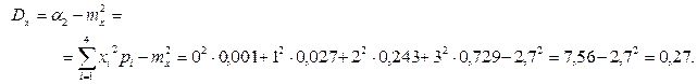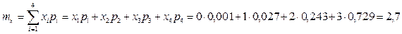 Найдем моду μ. μ = 3 поскольку значению x4= 3 отвечает максимальная вероятность p3 = 0,729.
