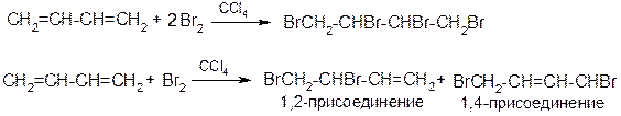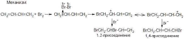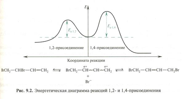 При низких температурах преимущество имеет 1,2-изомер как более быстро образующийся (кинетический контроль), при высоких температурах преимущество переходит к 1,4 изомеру как более термодинамически устойчивому (термодинамический контроль).