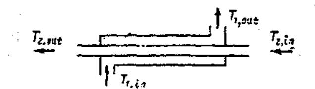 На рис. 1 буквой Т обозначена температура, индекс 1 относится к первому теплоносителю, а индекс 2 - ко второму; индекс in - означает условия на входе, а индекс out - на выходе из теплообменника.