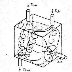 На рис. 6 показана воображаемая схема движения двух теплоносителей. Течение жидкостей в пространстве теплообменника оказывается трехмерным, при этом могут существовать зоны рециркуляции, в которых линии тока замкнуты.
