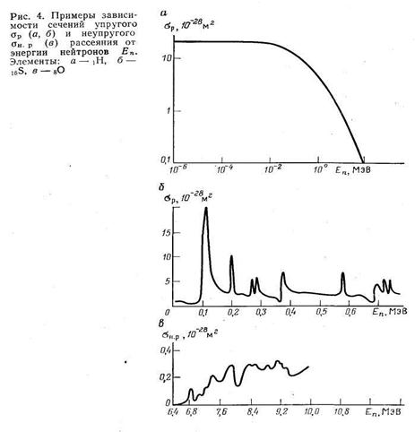 Сечение неупругого рассеяния σн.р. отличается от нуля при Еп> Еппор и при Еп =10—15 МэВ достигает максимального значения, составляющего для различных элементов величину от n•10-29 до n•10-28 м2 (см.рис.4,в). Угловое распределение неупругого рассеяния нейтронов изучено мало. Его обычно принимают изотропным в системе С.