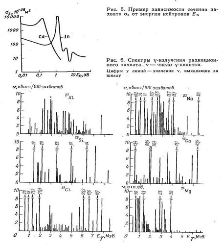 Спектр γ-квантов, образующихся по реакции радиационного захвата нейтронов (п, γ), различен для разных элементов (рис. 6). В табл. 1 приведены сечения некоторых реакций, вызываемых тепловыми нейтронами.