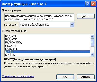 В MS Excel имеется 12 функций рабочего листа, используемых для анализа данных из БД. Эти функции имеют обобщённое название БДФункции.