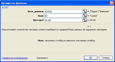 Аргумент «поле» может быть задан как текст с названием столбца в двойных кавычках, например «Возраст», «Телефон», или как адрес ячейки, содержащей название поля, например D5, Е5, F5, J5