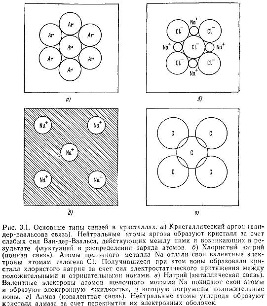 Твердое тело состоит из атомов. Само его существование указывает на наличие интенсивных сил притяжения, связывающих атомы воедино, и сил отталкивания, без которых между атомами не было бы промежутков. В результате таких взаимодействий атомы твердого тела частично теряют свои индивидуальные свойства, и именно этим объясняются новые, коллективные свойства системы атомов, которая называется твердым телом. По типу электронно-ионного взаимодействия различают 1) молекулярные кристаллы с взаимодействием Ван-дер-Ваалса, 2) ионные, 3) металлические, 4) ковалентные и 5) кристаллы с водородной связью.