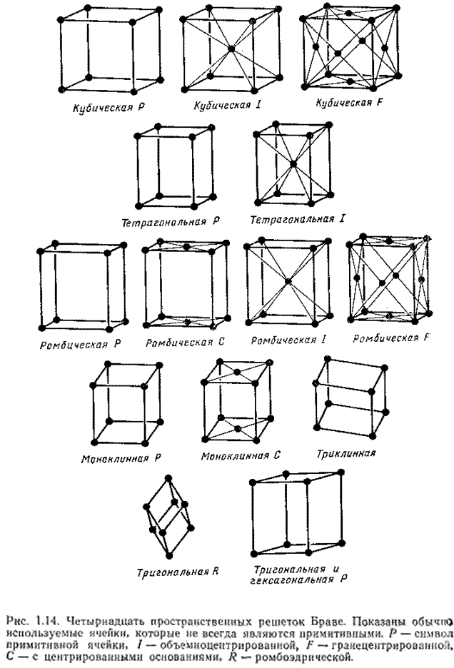 Всего существует 14 решеток Браве, распределенных по семи кристаллическим системам (сингониям).