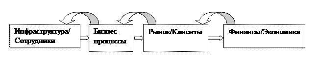 В рамках модели BalancedScorecard четыре упомянутых блока связываются между собой стратегической причинно-следственной цепочкой: квалифицированные, мотивированные, сплочённые в единую команду сотрудники, используя развитую инфраструктуру (информационные системы, оборудование, технологии), обеспечивают необходимое системе качество бизнес-процессов.
