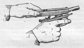 2) Присоединить затвор к рамке. Удерживая рамку за рукоятку в правой руке, а затвор в левой, ввести свободный конец возвратной пружины в канал затвора (рис. 6) и отвести затвор в крайнее заднее положение так, чтобы дульная часть ствола прошла через канал затвора и выступила наружу (рис. 7). Опустить задний конец затвора на рамку так, чтобы продольные выступы затвора поместились в пазах рамки, и, прижимая затвор к рамке, отпустить его. Затвор под действием возвратной пружины энергично возвращается в переднее положение. Включить предохранитель (поднять флажок вверх).