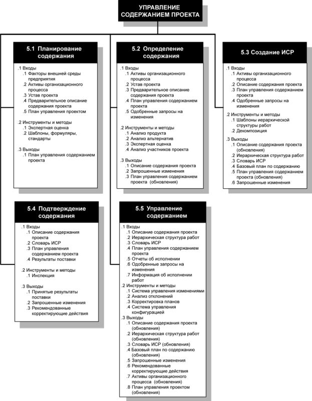 Управление содержанием проекта включает в себя процессы, обеспечивающие включение в проект всех тех и только тех работ, которые необходимы для успешного выполнения проекта. Оно непосредственно связано с определением и контролем того, что включено или не включено в проект. На рис.4-1 приведена общая схема процессов управления содержанием проекта.