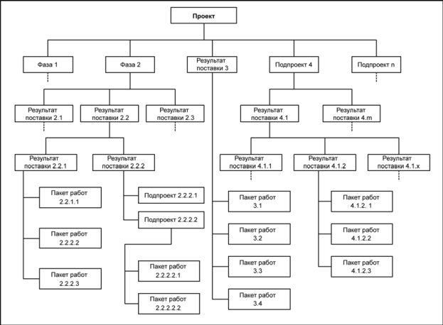 Рис. 4.2 Пример иерархической структуры работ с несколькими ответвлениями, разбитыми до уровня пакетов работ.