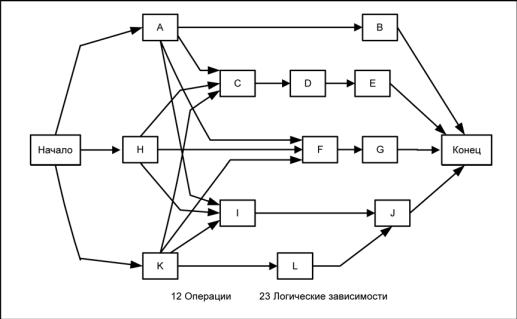 Метод предшествования – это метод построения сетевых диаграмм расписания проекта, в котором операции изображаются в виде прямоугольников (называемых "узлами"), а зависимости – соединяющими их дугами. На рис.5.1. показана простая сетевая диаграмма расписания проекта, составленная при помощи метода предшествования. Этот метод еще называется "операции в узлах"; он используется в большинстве пакетов программного обеспечения для управления проектами.