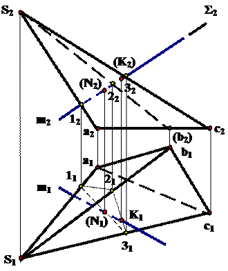 4. Отметить точки пересечения треугольника 112131 с m1 – N1, К1; N2, К2