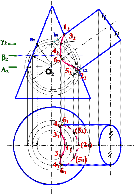 Определяются точки пересечения заданного ГО и построенной линии пересечения