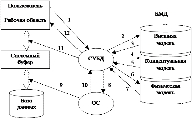 Рисунок 2.5 иллюстрирует взаимодействие пользователя, СУБД и ОС при обработке запроса на получение данных. Цифрами помечена последовательность взаимодействий: